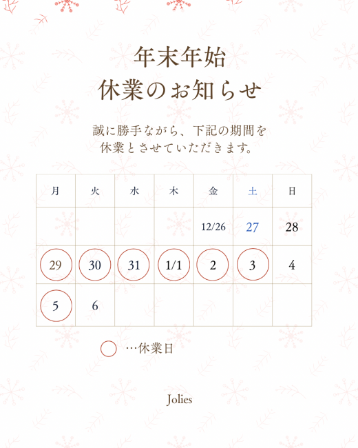 いつもJoliesをご利用していただきありがとうございます。今年の営業も残すところわずかとなりました。年々早く感じますね。最後まで全力でお客様の綺麗のお手伝いさせていただきます!スタッフ一同頑張ってまいります!