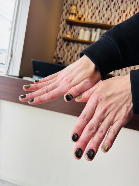 2026.02.10 後藤 ネイル! 今日はお客様のネイリストさんにお店に来ていただきモデルとしてネイルしていただきました!私の雰囲気に合わせてマットなスタイリッシュな感じでかっこよくしていただき満足でした!この歳になってネイルは恥ずかしいかと思いましたが、ちょっとハマりそう笑・・・ とても勉強になり楽しく有意義な時間でした!ありがとうございました!ロゴまで入れてくれました!